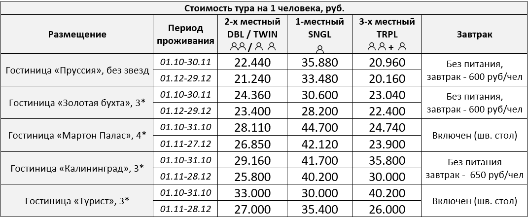 Питание: Завтраки (в г-цах: «Пруссия», «Золотая бухта» и «Калининград»), Обеды и Ужины