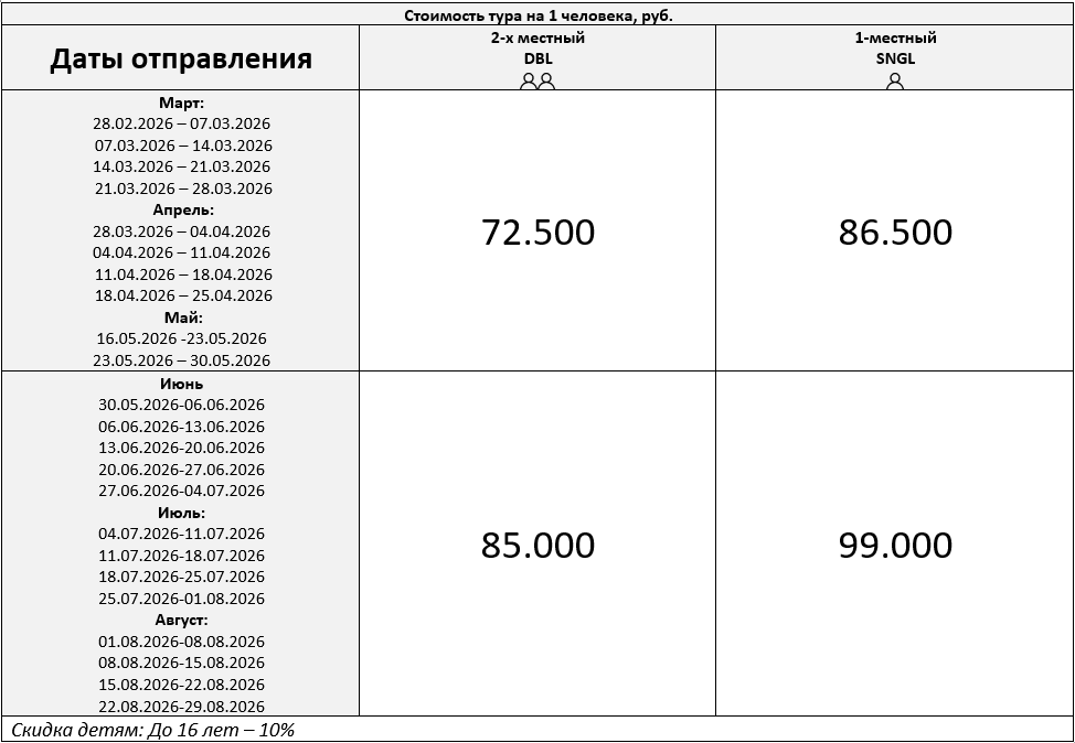 - Обратный трансфер в последний день тура: отправление с базы размещения в 10.00 ч. (обратные билеты брать с отправлением после 16.00)