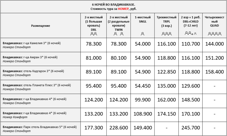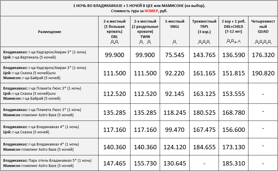 Новогодние ужины 31.12.2025 (по желанию): Панорамный ресторан 360 (г-ца Парк Отель Владикавказ 5*): взр-8000 руб, реб до 18л-6000 руб, детское меню до 8 лет-2000 руб. Загородный ресторан Торне: взр-7000 руб, реб до 18л-5000 руб, детское меню до 8 лет-2000 руб. Загородный ресторан Хохаг: взр-7000 руб, реб до 18л-5000 руб, детское меню до 8 лет-2000 руб. Ресторан г-цы Кадгарон: взр-6000 руб, реб до 18л-3000 руб, детское меню до 8 лет-бесплатно.