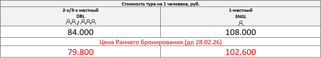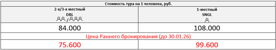 Одноместное размещение: 24.000 руб. за весь период тура