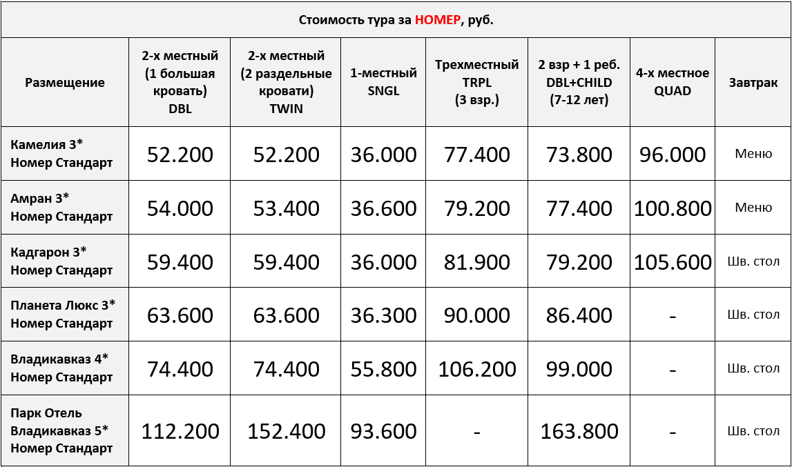 Прибытие во Владикавказ, подача транспорта в аэропорт/ж.д. вокзал с 08:00 до 14:00 к любому рейсу/поезду, встреча и групповой трансфер в гостиницу.