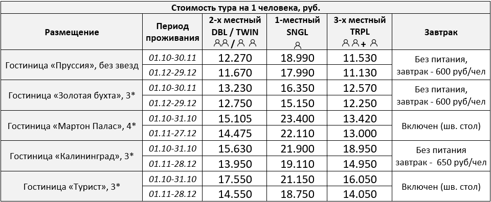 Питание: Завтраки (в г-цах: «Пруссия», «Золотая бухта» и «Калининград»), Обеды и Ужины