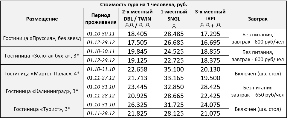Питание: Завтраки (в г-цах: «Пруссия», «Золотая бухта» и «Калининград»), Обеды и Ужины