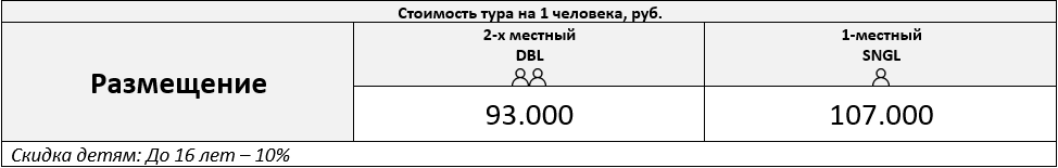 - Обратный трансфер в последний день тура: отправление с базы размещения в 10.00 ч. (обратные билеты брать с вылетом после 17.00)