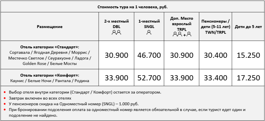 Оплачивается заранее (по желанию): Бронирование мест в автобусе: 2 ряд за водителем/гидом - 500 руб./чел.; 3 ряд за водителем/гидом - 400 руб./чел.; 4 и последующие ряды за водителем/гидом - 300 руб./чел.