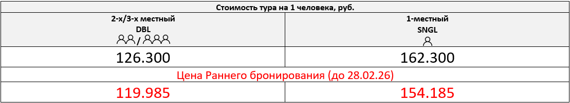 Одноместное размещение: +36.000 руб. за весь период тура