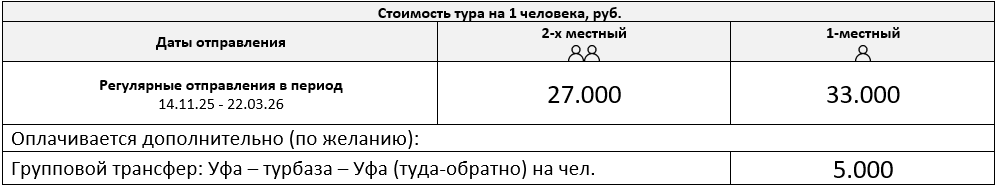 Групповой тансфер до места начала тура (туда - обратно): из Уфы - 5000 руб/чел. Индивидуальный под запрос