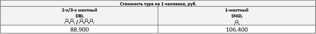 Одноместное размещение: +17.500 р. за весь период тура
