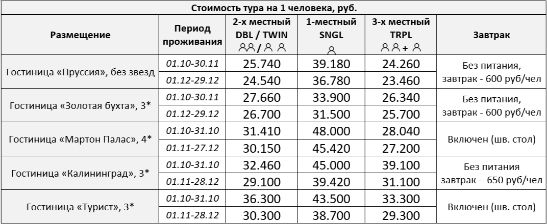 Питание: Завтраки (в г-цах: «Пруссия», «Золотая бухта» и «Калининград»), Обеды и Ужины