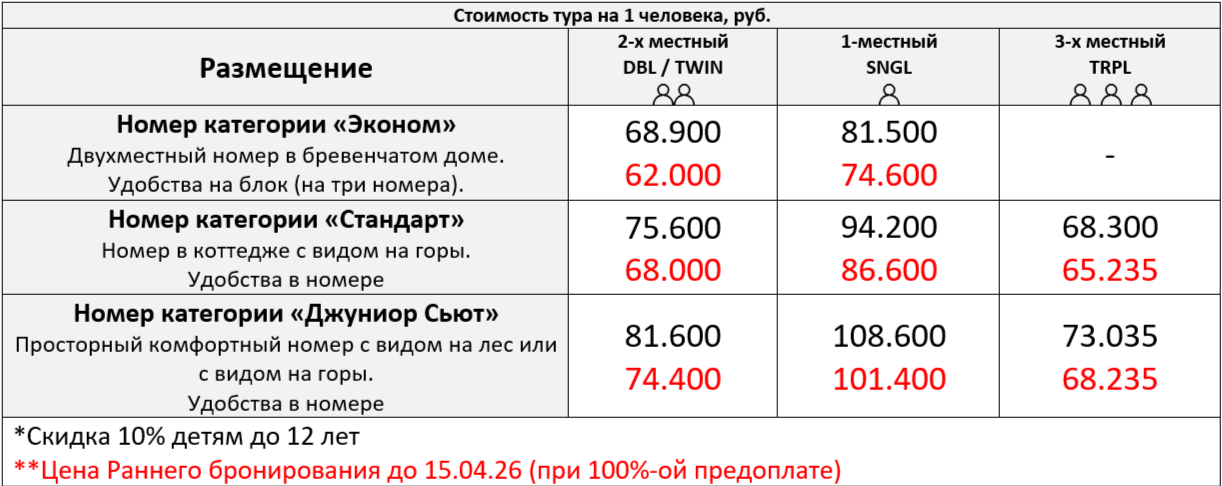 Трансфер (в обе стороны) НЕ включен в стоимость тура и оплачивается дополнительно: