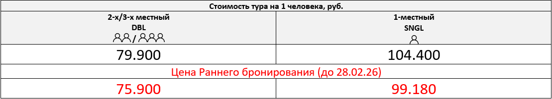 Одноместное размещение: +24.500 руб. за весь период тура
