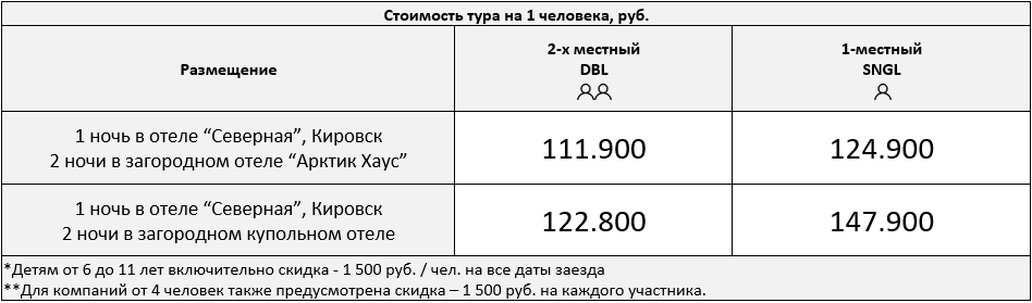 2) Во все даты КРОМЕ заезда 30.04-03.05.26 предусмотрен 1 дополнительный выезд на Северное Сияние (в случае, если 1ый выезд будет неуспешный)