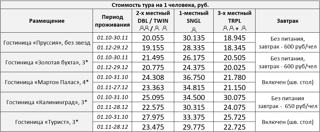 Питание: Завтраки (в г-цах: «Пруссия», «Золотая бухта» и «Калининград»), Обеды и Ужины