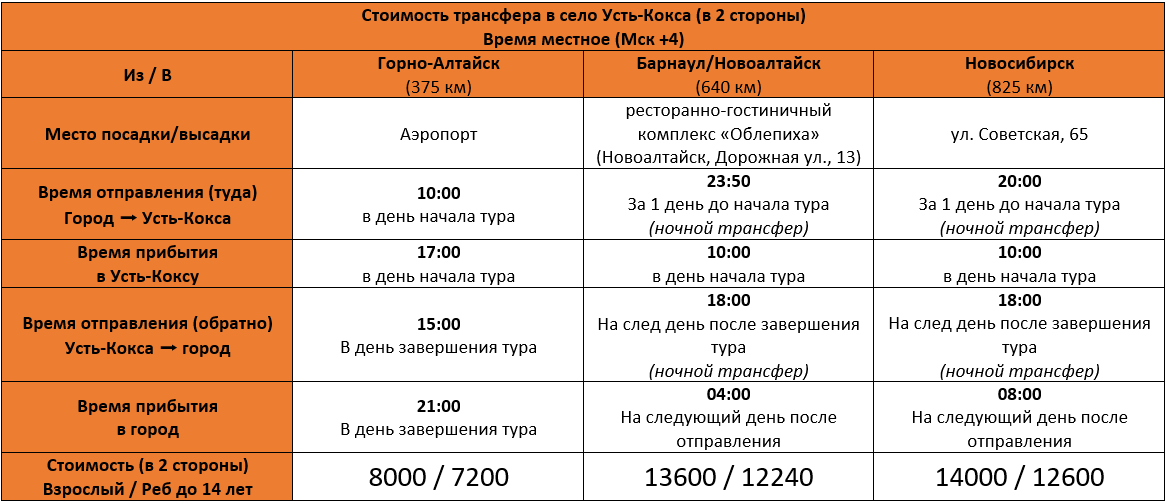 !Важно Тур начинается в селе Усть-Кокса. Вы можете добраться до места самостоятельно или воспользоваться трансфером из Новосибирска, Барнаула/Новоалтайска или Горно-Алтайска.