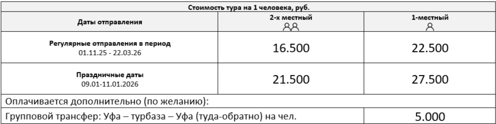 Базовая стоимость тура: В день отъезда туристы самостоятельно выезжают из с. Имендяшево (до 15.00 ч. по местному времени).