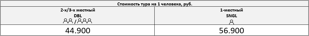 Одноместное размещение: +12.000 р. за весь период тура