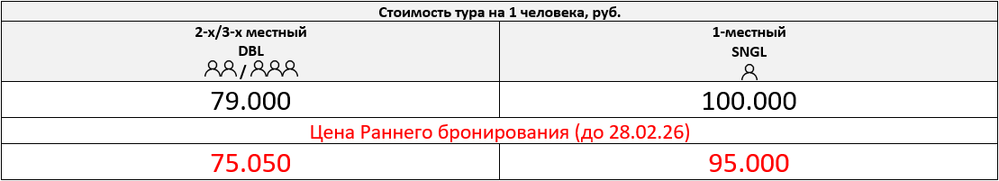 Одноместное размещение: 21.000 руб. за весь период тура