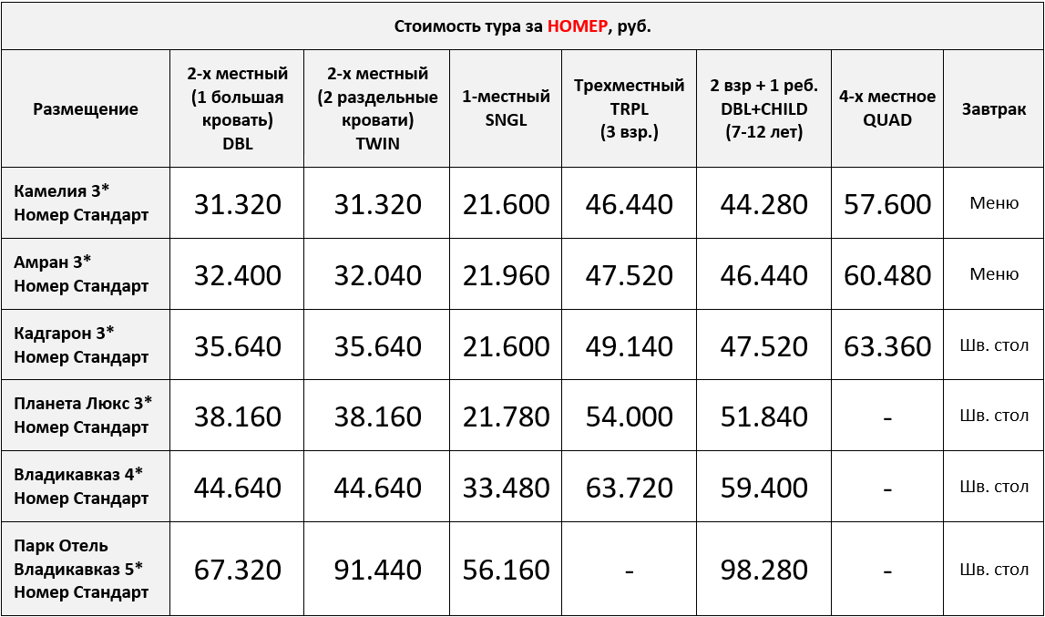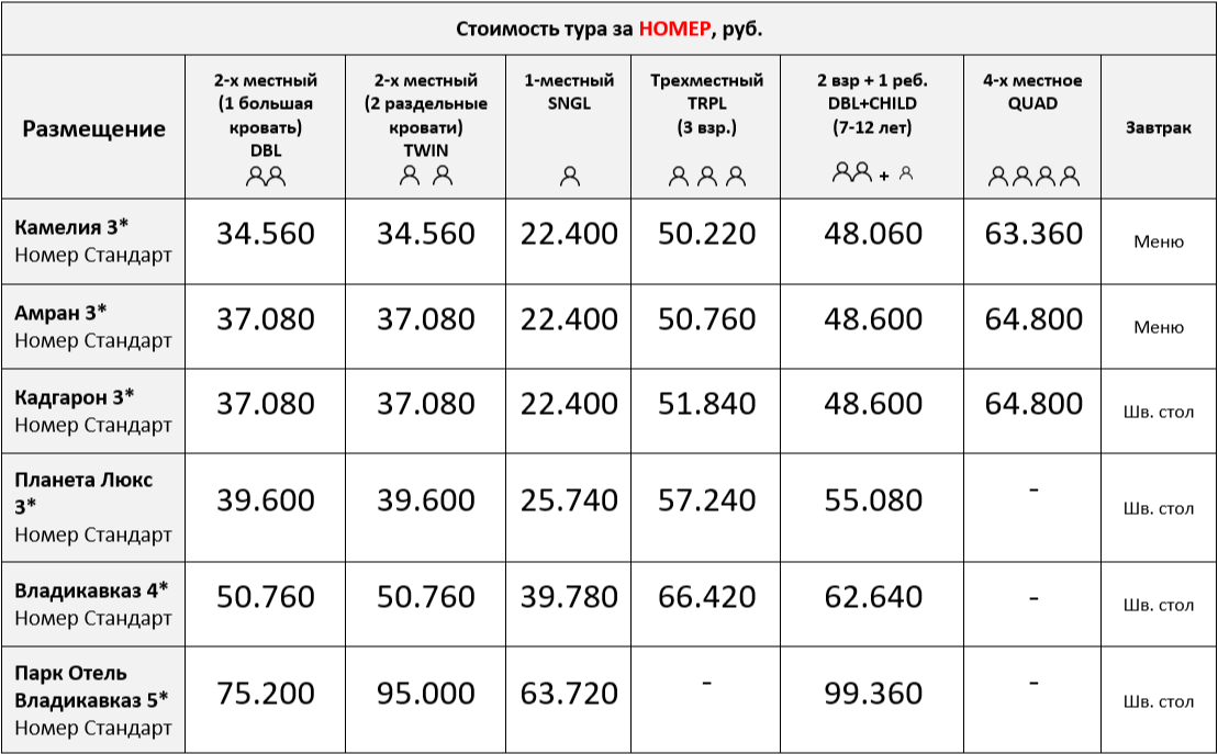 Групповые трансферы из аэропорта и ж/д вокзала Владикавказа в гостиницы в первый день тура ко всем рейсам/поездам по прибытии с 08:00 до 14:00