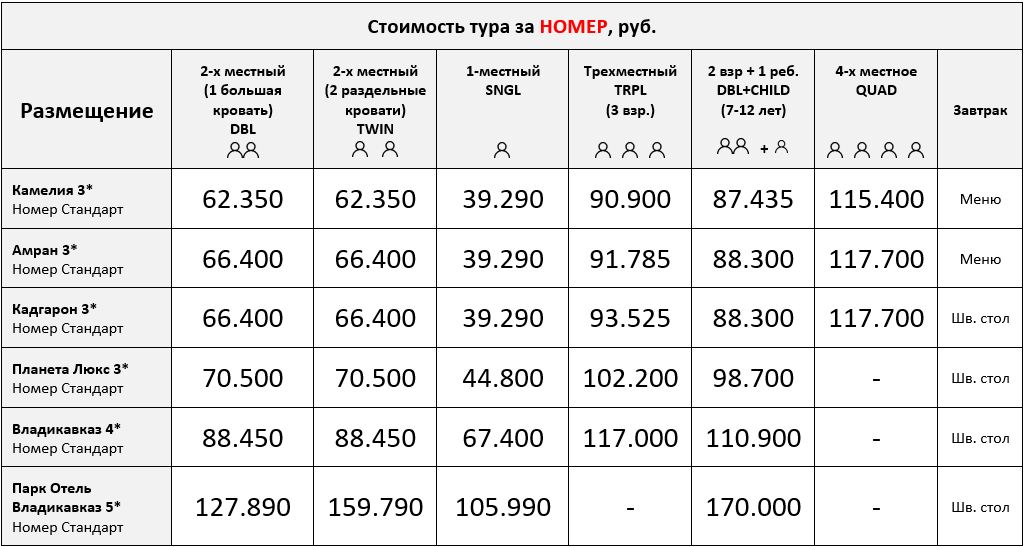 Групповые трансферы из гостиниц в аэропорт и ж/д вокзал Владикавказа по отъезду в заключительный день тура к рейсам/поездам после 19:00