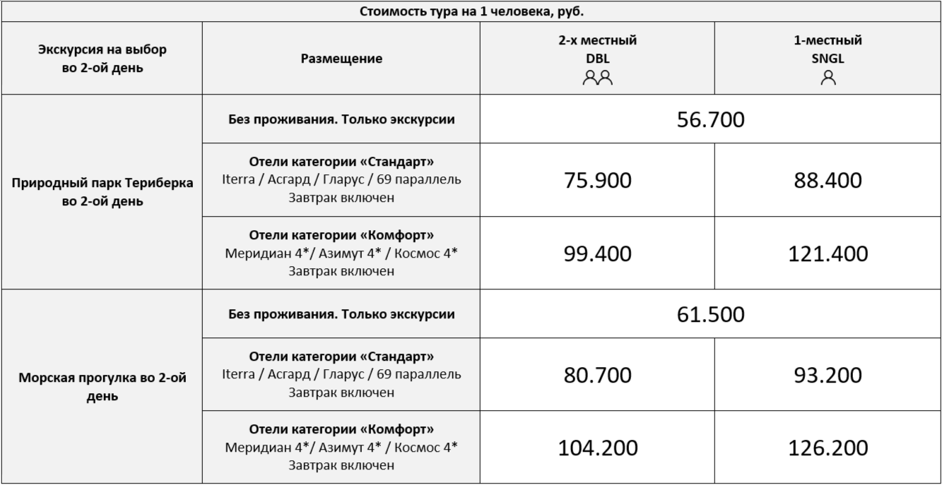 Также возможно объединение второго и третьего дня тура с перерасчетом стоимости тура.