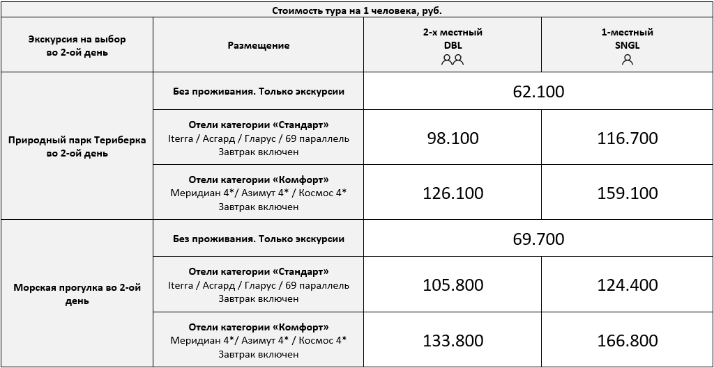 Также возможно объединение второго и третьего дня тура с перерасчетом стоимости тура.