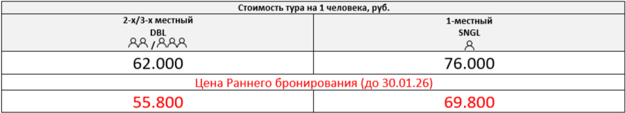 Одноместное размещение: +14.000 руб. за весь период тура