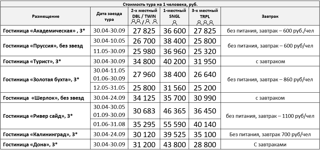 Питание: Завтраки, при размещении в отелях: «Турист», «Шерлок», «Дона»
