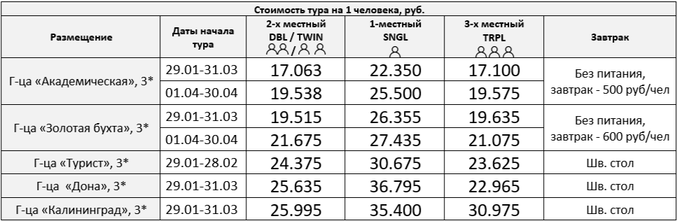 Питание: Завтраки (в г-цах: «Пруссия», «Золотая бухта» и «Калининград»), Обеды и Ужины
