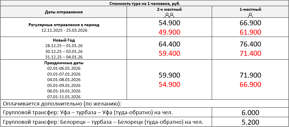 Групповой тансфер до места начала тура (туда - обратно): из Уфы - 6000 руб/чел, из Белорецка - 5200 руб/чел. Индивидуальный под запрос