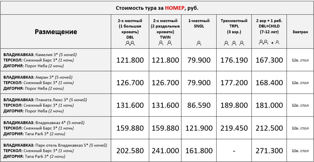 Групповые трансферы из аэропорта и ж/д вокзала Владикавказа в гостиницы в первый день тура ко всем рейсам/поездам по прибытии с 08:00 до 14:00