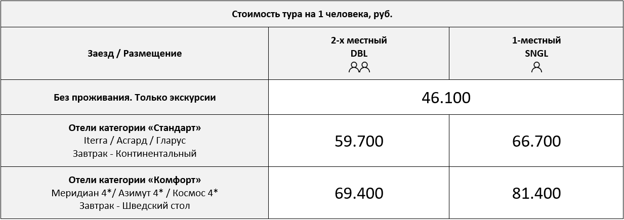 Ваш гид объявит время выезда накануне, предварительно это будет 8:00 утра (время может корректироваться).