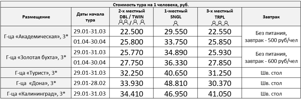Питание: Завтраки (в г-цах: «Пруссия», «Золотая бухта» и «Калининград»), Обеды и Ужины