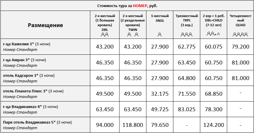 Групповые трансферы из аэропорта и ж/д вокзала Владикавказа в гостиницы в первый день тура ко всем рейсам/поездам по прибытии с 08:00 до 14:00