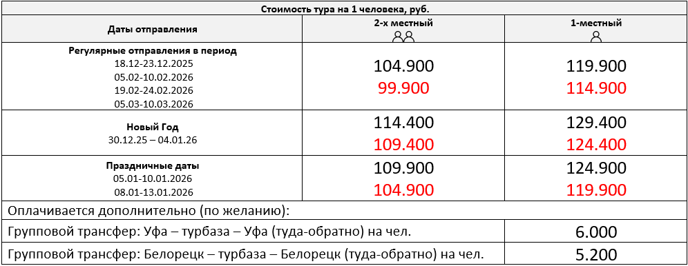 Групповой тансфер до места начала тура (туда - обратно): из Уфы - 6000 руб/чел, из Белорецка - 5200 руб/чел. Индивидуальный под запрос