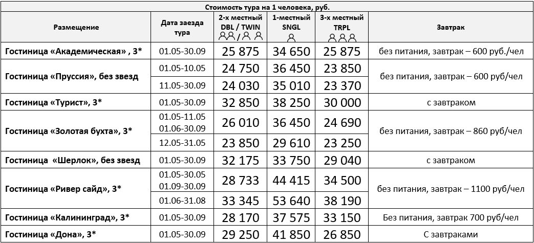 Питание: Завтраки, при размещении в отелях: «Турист», «Шерлок», «Дона»